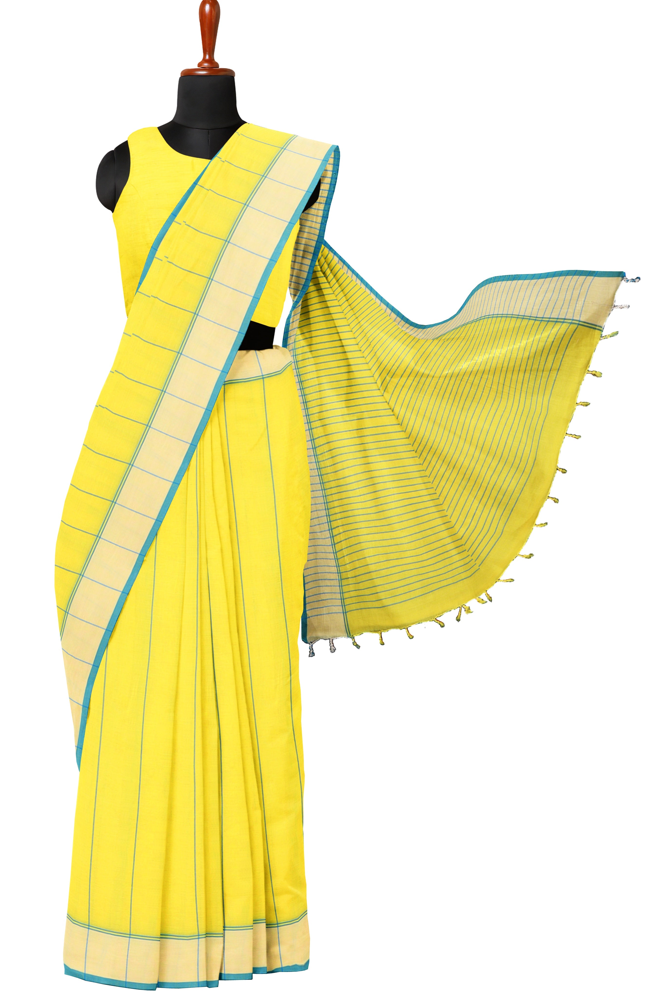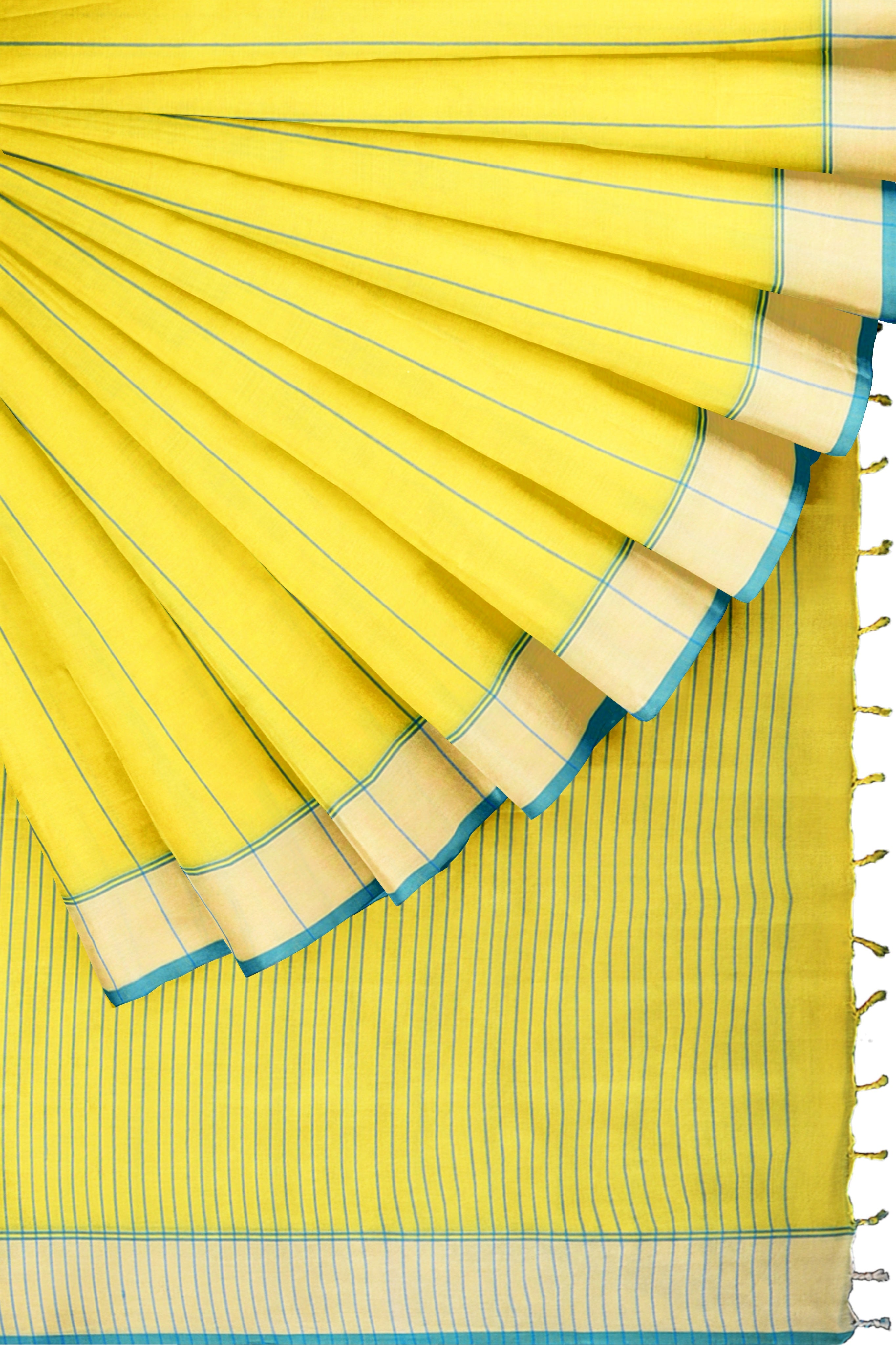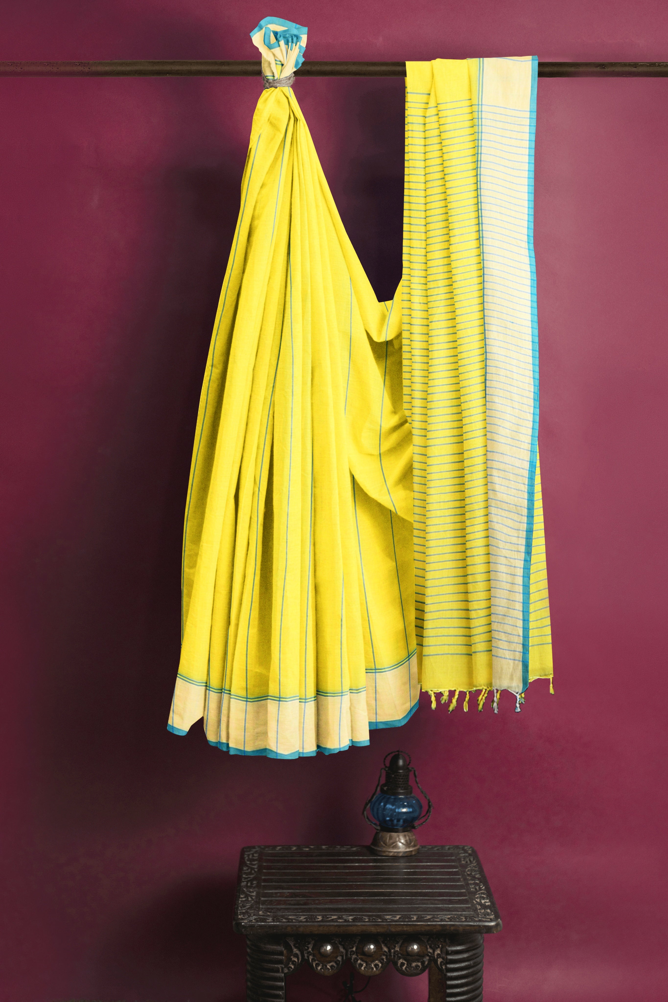 Lemon Saree with Sky Blue Base and Cream, Sky Blue Border